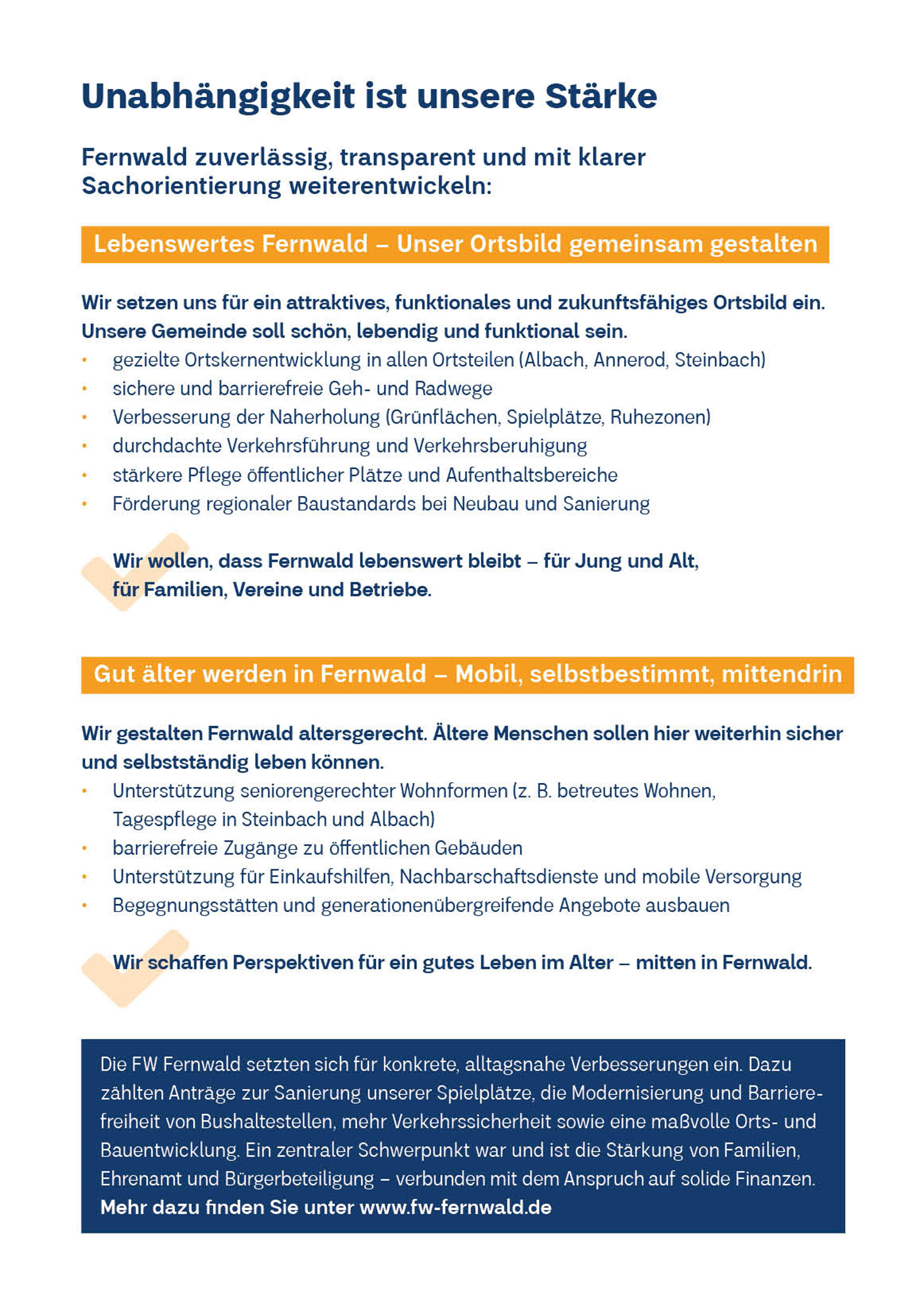 Genau dafür setzen sich die Freien Wähler Fernwald ein: mit Sachverstand, Herzblut und einem offenen Ohr für die Menschen vor Ort. Seit vielen Jahren stehen wir für bürgernahe Kommunalpolitik, die nicht von Ideologien, sondern von den tatsächlichen Bedürfnissen unserer Gemeinde geprägt ist. Wir hören zu, wägen ab und entscheiden verantwortungsvoll – immer mit dem Blick auf das Machbare und Sinnvolle.