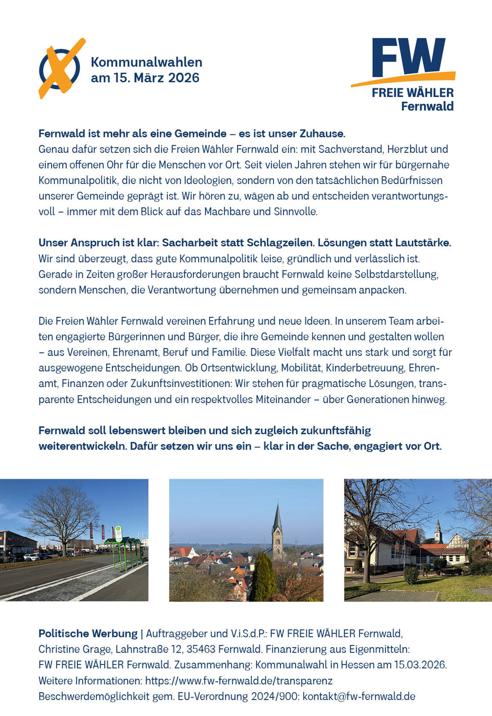 Wir sind überzeugt, dass gute Kommunalpolitik leise, gründlich und verlässlich ist. Gerade in Zeiten großer Herausforderungen braucht Fernwald keine Selbstdarstellung, sondern Menschen, die Verantwortung übernehmen und gemeinsam anpacken.
